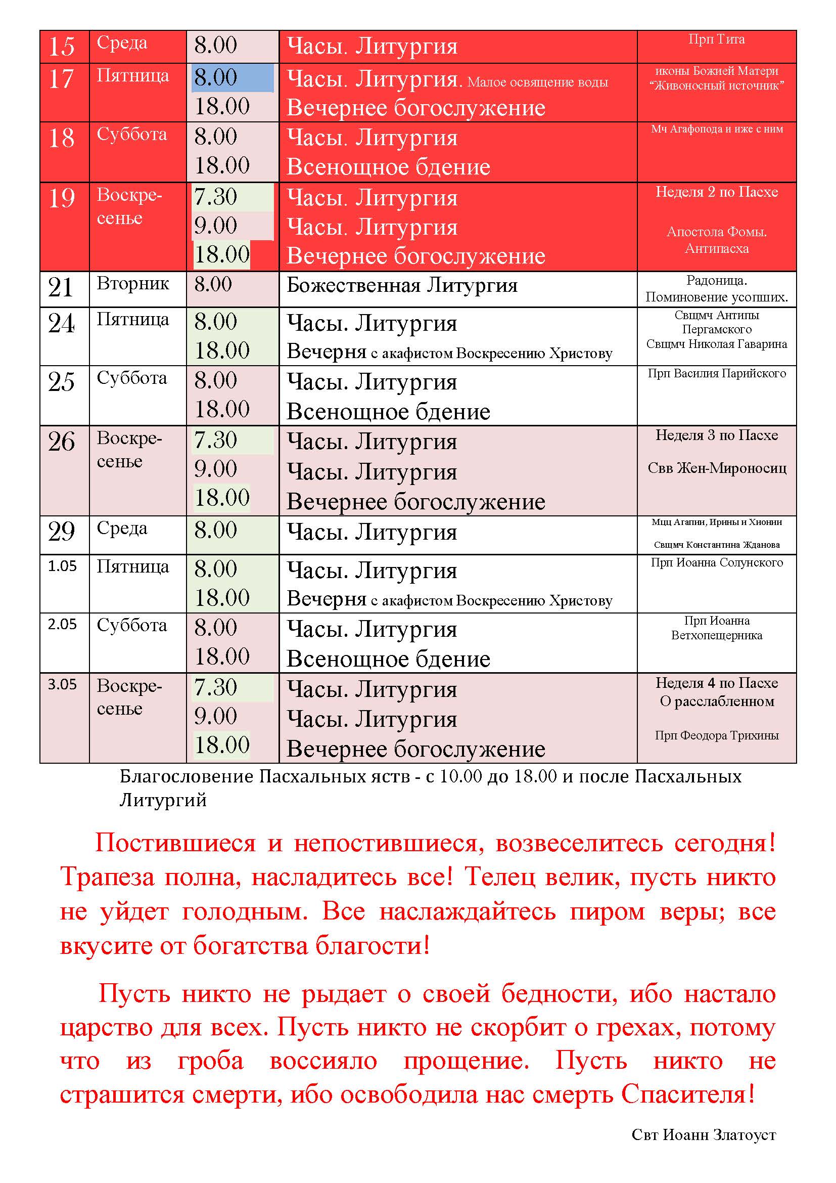 Расписание богослужений